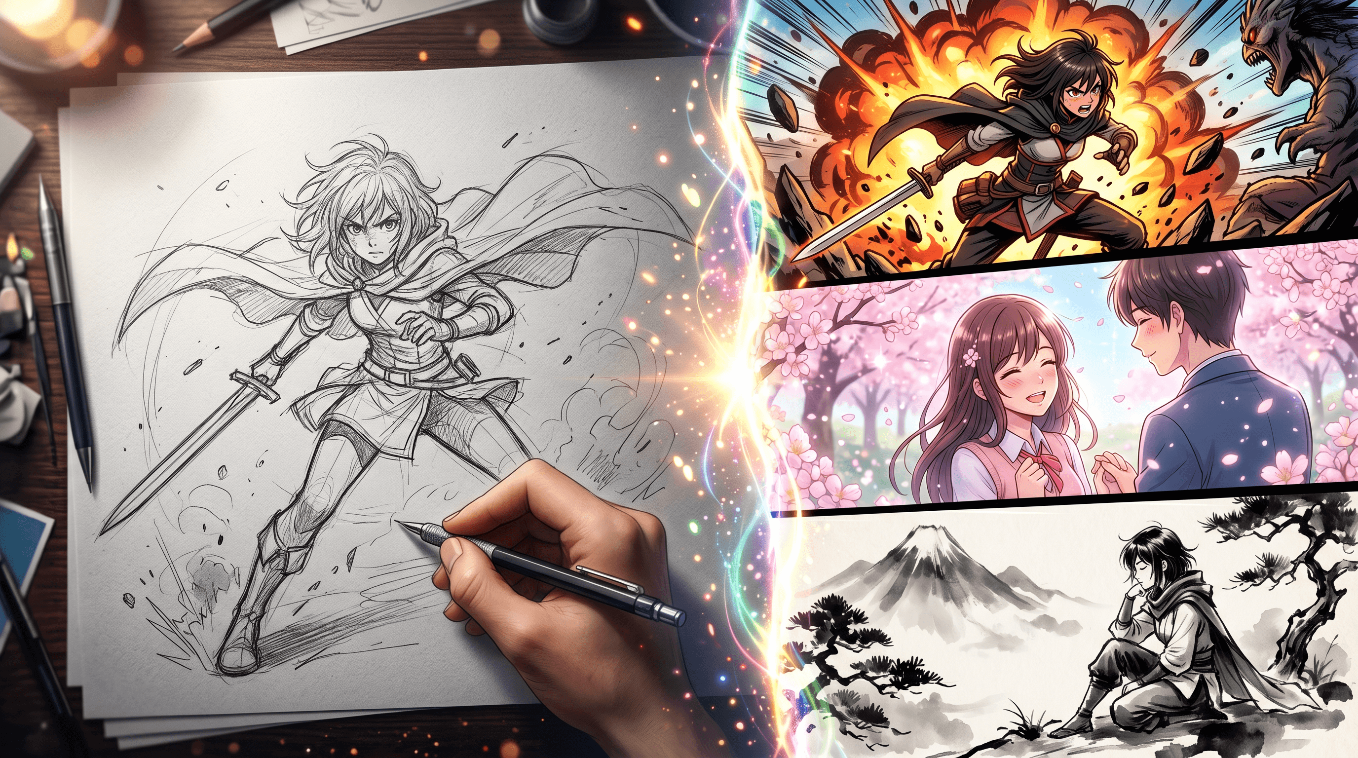 Learn how to turn pencil sketches into anime and manga art with AI. Step-by-step guide with Shonen, Shojo, and wabi-sabi style examples.