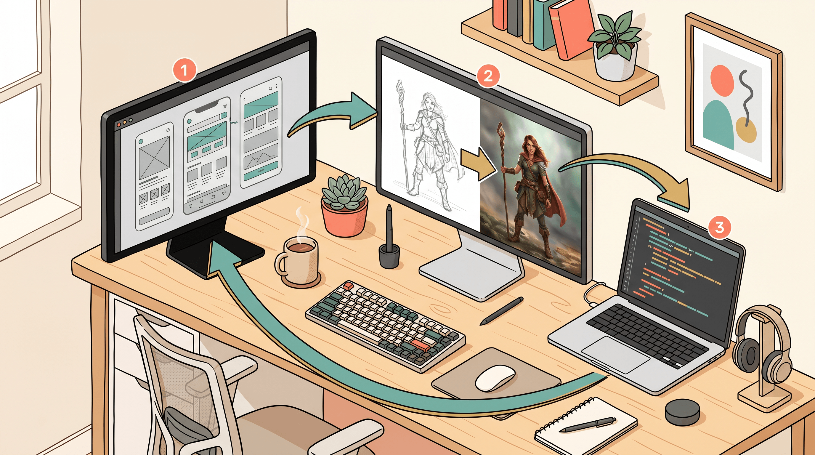 A common indie-dev stack is: design the UI in one tool, generate the imagery in a second tool, ship the code from a third. Here is a concrete flow that uses each of the three AI design tools for what they do best, plus a lightweight image step.