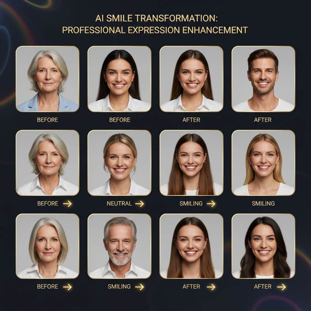 Professionals use our AI smile filter to transform serious headshots into warm, approachable portraits. Add natural smiles to corporate photos, LinkedIn profiles, and business cards with our AI smile filter for better first impressions.