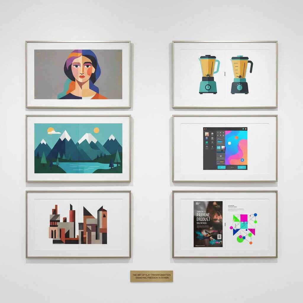 Our flat illustrative style tool creates artwork with bold colors, simplified shapes, and minimal gradients. Experience the signature flat illustrative style look with geometric precision and modern visual appeal.