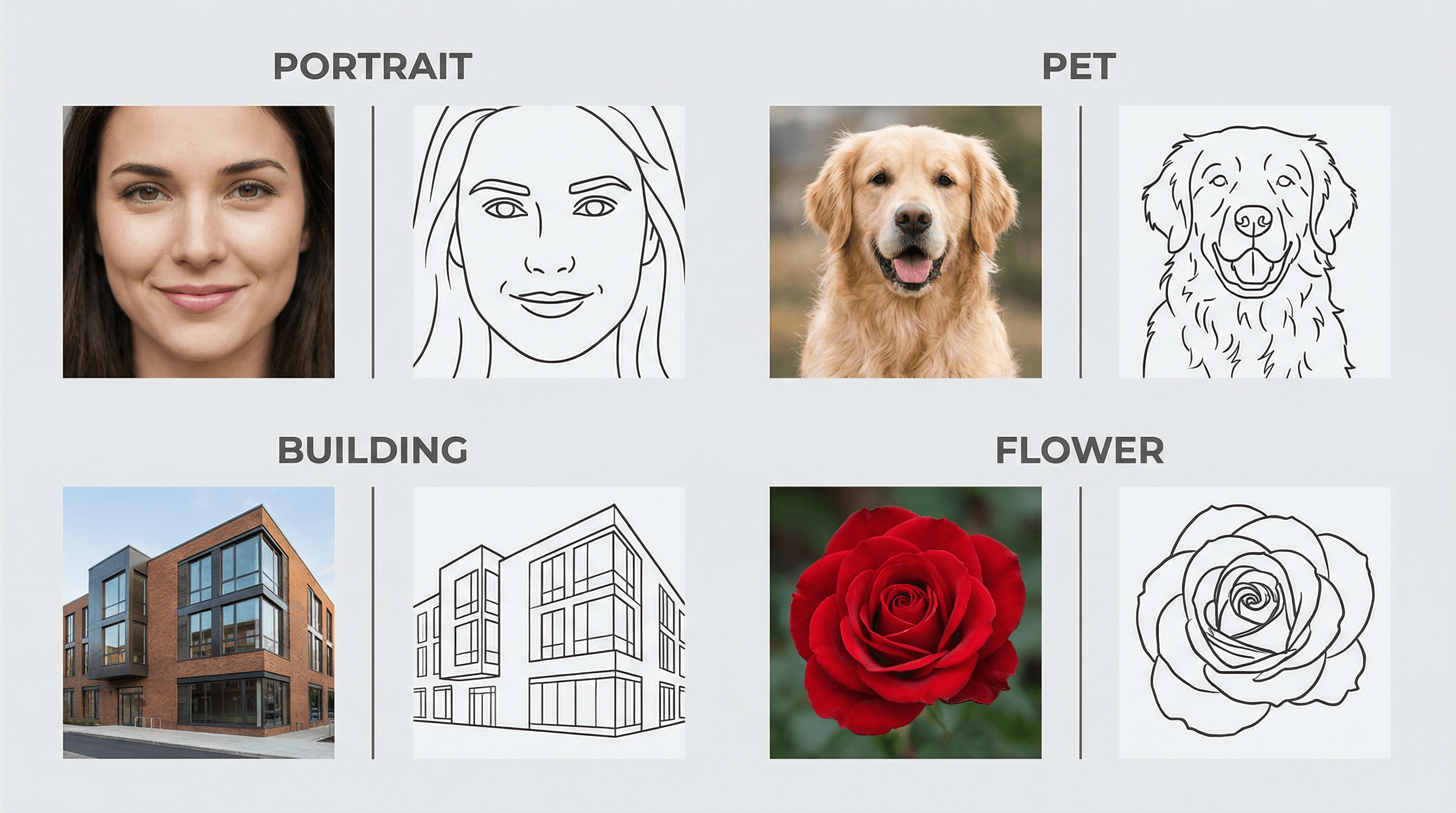 线条画把照片简化到最基本的轮廓和形状。它在设计、插画和印刷领域都有广泛应用——从婚礼请柬、儿童涂色书,到 logo 参考稿和建筑草图。